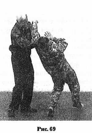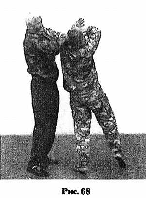 Через поверхность контакта в легком приседании начинаем приложение силы массы своего тела и создаем опрокидывающий момент таким образом, чтобы проекция вектора массы противника начала выходить за пределы его площади опоры (левой ноги). Одновременно не прекращается действие крутящего момента. Усиливаем воздействие путем рубящего удара правой рукой в шею противника (рис. 68).