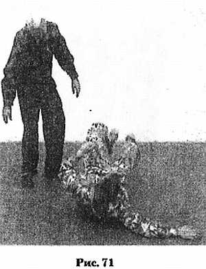 III фаза. В заключительной фазе, предварительно «выставив» противника (рис. 72) как незащищенную цель, наносим соответствующие удары, к примеру, ногами по его коленным суставам.