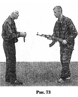 I фаза. Ситуация угрозы автоматом (длинноствольным оружием) на дистанции РБ при наличии у защищающегося ножа (рис. 73).