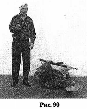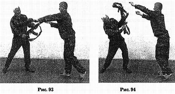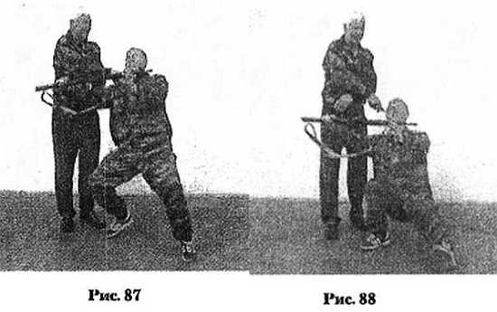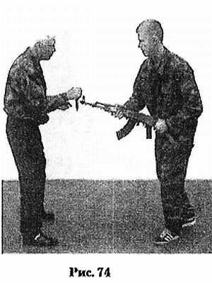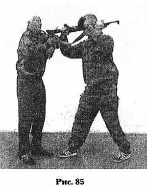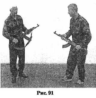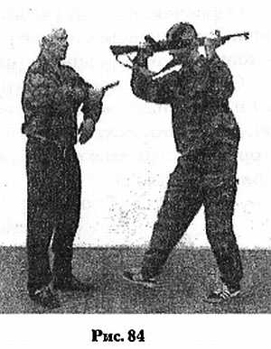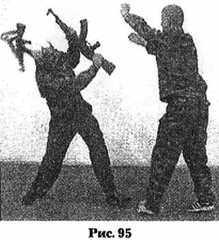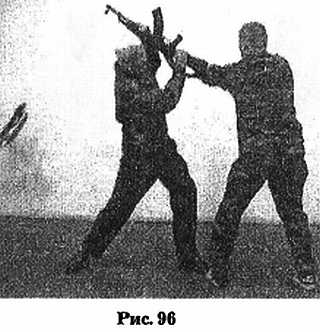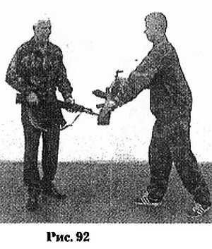 Отшагивая правой ногой назад и используя свой автомат как рычаг, обезоруживаем противника (рис. 93 и 94).