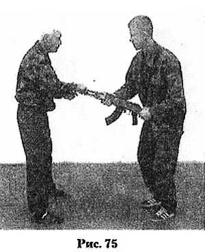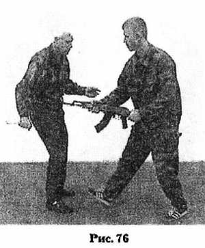 зацепив плоскостью ножа ствол автомата в районе мушки, рывком с вращением резко ускоряем оружие противника по направлению производимого им удара (рис. 76).