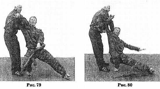 Сила удара имеет своей целью не только поражение жизненно важных органов противника, но и увеличение крутящего и опрокидывающего моментов. Вследствие комплексного воздействия окончательно нарушаем равновесие противника, и это действие влечет за собой потерю им оружия при попытке удержать баланс (рис. 80).