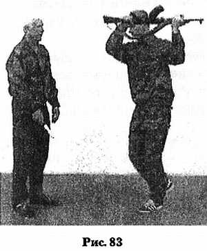 I фаза. Ситуация атаки боковым ударом прикладом на дистанции РБ при наличии у защищающегося ножа (рис. 83). Требование к своему психофизическому состоянию сходно с требованиями в рассмотренных выше ситуациях угроз и атак оружием.