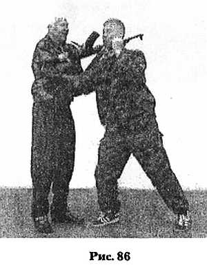 Создавая с помощью ножа и своих предплечий направляющие поверхности для разложения силы атаки на ее составляющие, не мешаем направлению движения удара противника, при этом вращением ножа в зоне контакта придаем дополнительное ускорение автомату (рис. 85). Затем своей левой рукой и воздействием ножа в район горла атакующего создаем пару сил, обеспечивающую крутящий момент относительно оси его позвоночника.