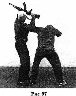 Соблюдая требование по соосности центров тяжести своего тела и собственного оружия (центр тяжести автомата и своего тела должен лежать на одной оси во избежание паразитических моментов сил, дополнительно нагружающих защищающегося), наносим удар прикладом в локтевой сустав противника (рис. 96).