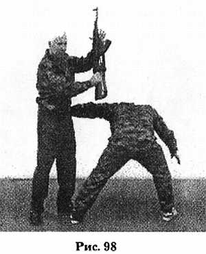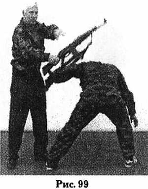 III фаза. Проводим завершающий (рис. 99) удар в область позвоночника противника, суммируя в нем массу своего тела и рычажно-рубящее воздействие автомата.