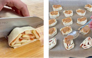 Слоёное сырое тесто всегда нужно нарезать только самым острым и тонким ножом, чтобы не смять и не «запечатать» слои, в этом случае они не смогут раскрыться при выпечке и тесто утратит воздушность.