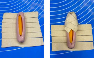 4. На середину теста положить сосиску с сыром, свернуть тесто как вам удобно, можно косичкой, как я показала вам на фото.