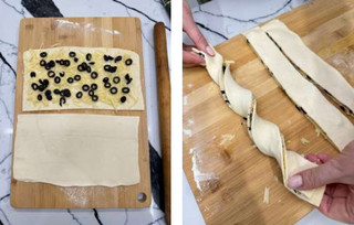 2. На одну часть теста присыпать натёртым сыром, разложить нарезанные оливки колечками.