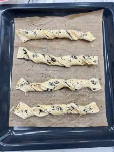 6. Спирали выложить на противень с бумагой для выпечки, сверху смазать яйцом, присыпать кунжутом.