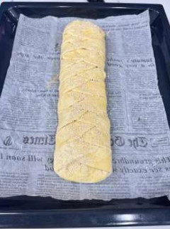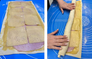4. По длинной стороне теста выложить начинку и свернуть тесто рулетом.