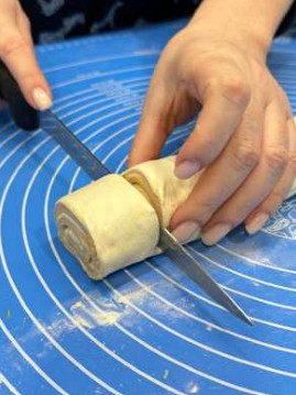 6. И теперь сверните полоску с начинкой в «улитку» так, чтобы шов был внутри «улитки». Благодаря этому, слойки будут хорошо держать форму и не деформируются во время выпечки. Конец рулета подвернуть под «улитку».