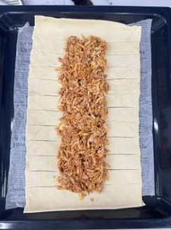 5. Выложить начинку вдоль всей полоски, поднять края теста, хорошо защепить. Смажьте шов небольшим количеством молока.