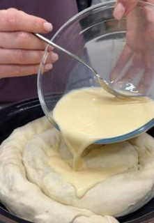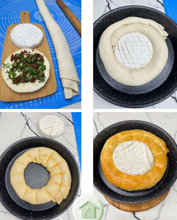 5. В круглую форму для выпечки d=25 см. на середину выложить сыр Бри. Вокруг сыра завернуть рулет из теста с начинкой в улитку. Вынуть из формы сыр Бри.