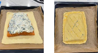 6. По тесту тупой стороной ножа сделать насечки (для порционных кусочков), смазать тесто яйцом, поставить форму в нагретую духовку 200° на 25 минут. Вынуть форму выложить, в середину обратно сыр Бри и отправить духовку и ещё на 5 минут.