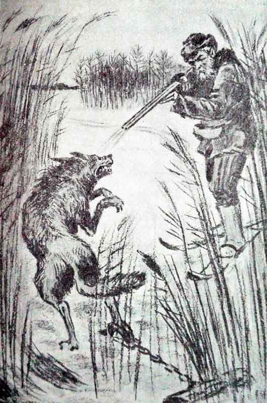 Спускаясь со снежного бугра, Тимофей столкнулся с хищником. Сжавшись в комок, тот лежал в камышовом курене, положив голову на передние лапы. Охотник едва успел затормозить лыжи, как волк сделал прыжок к его сторону..