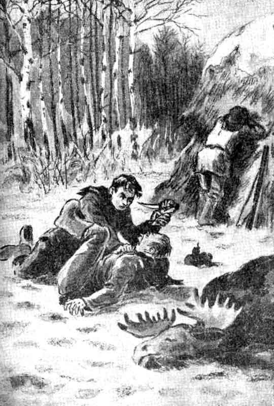 Завернув за стог, охотник оторопел. На снегу, распластав могучую тушу, лежал лось. Из-под него торчали две пары лыж. Видно, он был так тяжёл, что охотникам пришлось использовать это простейшее приспособление, чтобы подтащить тушу к стогу. Андронников и Салим, быстро работая ножами, сдирали шкуру, на не успевшем ещё остыть теле лося подрагивали живчики.