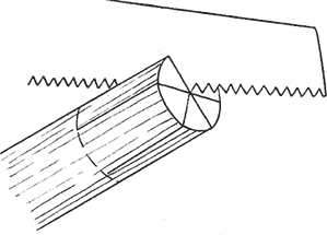 Выполните пропилы, направляя ножовку от нанесенной по окружности линии к середине торцевой стороны заготовки (рис. 28). Спилите клиновидные сегменты, ведя инструмент от соседних разметочных линий (рис. 29, а), и удалите те, что находятся с торцевых сторон каждой части детали (рис. 29, б). Выровняйте поверхность спилов стамеской (рис. 30), а затем обработайте ее, используя теплую олифу или масло (рис. 31).