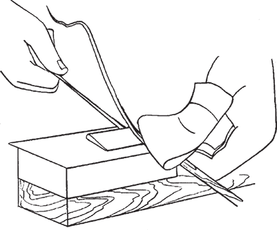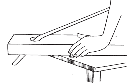 Заготовки для лент (шины) отстрогайте по толщине (рис. 32). В это время деталь следует держать перед ножом инструмента, прижимая ее большим пальцем (для его защиты используйте напаличник или кусок толстой кожи).
