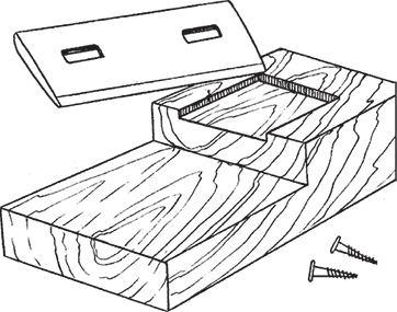 Чтобы сделать режущий элемент шофа, возьмите лезвие электрорубанка с отверстиями и прикрепите его к дощечке, выпиленной из древесины твердых пород. Последняя должна иметь углубление для установки лезвия (рис. 33).