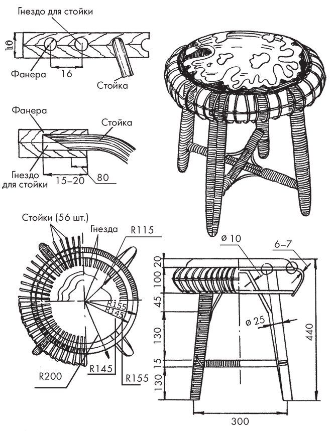 Вы можете изготовить табурет с тремя, четырьмя или восемью ножками. Он может быть жестким или полумягким, с проножками или без них. Размеры деталей и сборка узлов квадратного, полумягкого и круглого ажурного табуретов показана на рис. 37–39. Все эти модели изготавливаются по одному и тому же принципу. Вам понадобятся мебельная палка толщиной 20–30 мм, пластины, ленты и прутья диаметром 5–10 мм. Средняя высота табурета – 420–450 мм, а диаметр сиденья – 330–390 мм.