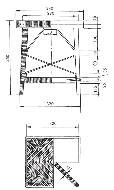 Рис. 38. Табурет с квадратным сиденьем (размеры указаны в миллиметрах)
