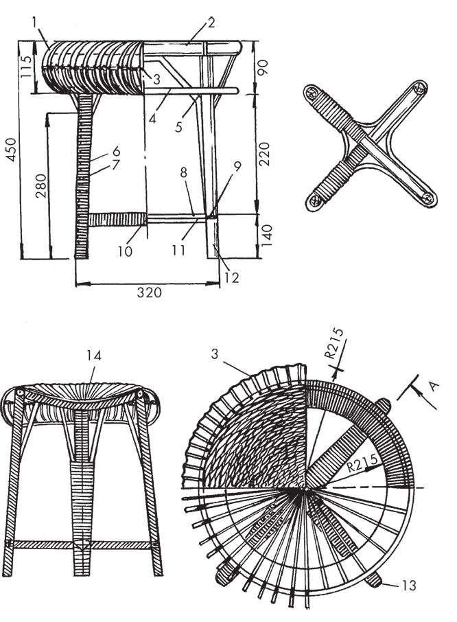 Рис. 39. Круглый ажурный табурет (размеры указаны в миллиметрах): 1 – ажур; 2 – верхнее кольцо; 3 – декоративная лента ажура; 4 – нижнее кольцо; 5 – подстрелка; 6 – лента; 7 – декоративная лента; 8 – проножка; 9 – обвивка; 10 – подлучка; 11 – гвоздь (20, 30, 40 или 60 мм); 12 – ножка; 13 – вставка крышки сиденья; 14 – упорная палка верхнего кольца