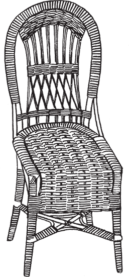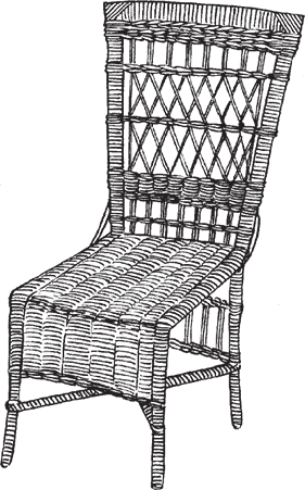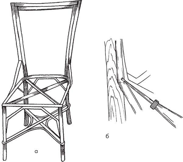 Рис. 62. Начало плетения веревочки из трех белых прутьев в верхней части спинки стула