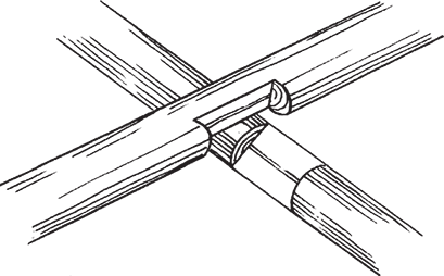 Изготовление и установка крестовиныВырежьте палки нужного размера. Чтобы можно было состыковать их между собой, в центре каждой из них выполните надрез вполдерева (рис. 42). Упоры для огибания ножек в местах огибания надрежьте до середины с помощью ножа, а затем аккуратно промните круглогубцами (рис. 43).