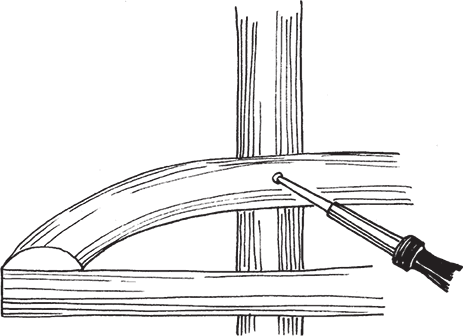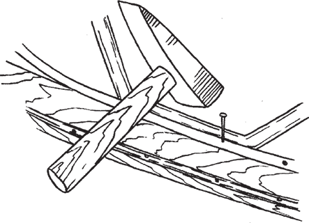 Крепление прутиков к сиденьюЧтобы усилить прочность каркаса, вдоль задней внутренней части сиденья прибейте два тонких прутика. Они должны располагаться параллельно друг другу (рис. 46).