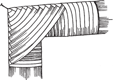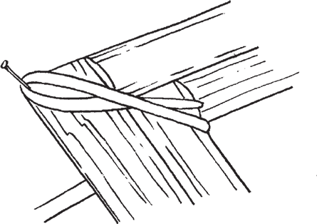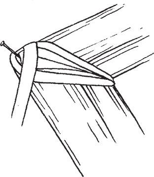 Обматывание лентой передних углов сиденьяВ угол сочленения неглубоко вбейте небольшой гвоздь и сделайте вокруг него петлю (рис. 53), затем проведите ленту под левой палкой и выполните полуоборот вокруг гвоздя, после чего пропустите ленту под нижнюю палку (рис. 54). После этого выведите ленту к гвоздю, оберните ее вокруг него, затем подведите под правую палку и т. д.