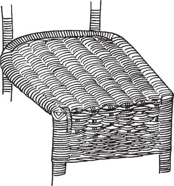 Фиксация стоячков веревочкой из 3 прутьевНачните плести веревочку с толстого конца прута (сделайте им оборот вокруг рамы сиденья). Сначала наложите прутья сверху на два стоячка, а затем протяните под первый стоячок и так чередуйте (рис. 57).