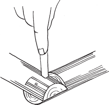 Деревянное приспособление можно сделать и своими руками. Для этого вам потребуется круглая заготовка диаметром 3 см и длиной 10 см. Отступите от края детали на 4 см и нанесите по окружности линию, а затем сделайте разметку торцевых сторон (разделите плоскость на четыре равные части, а затем каждую из них – пополам). После этого нанесите на заготовку оставшиеся разметочные линии (рис. 27).