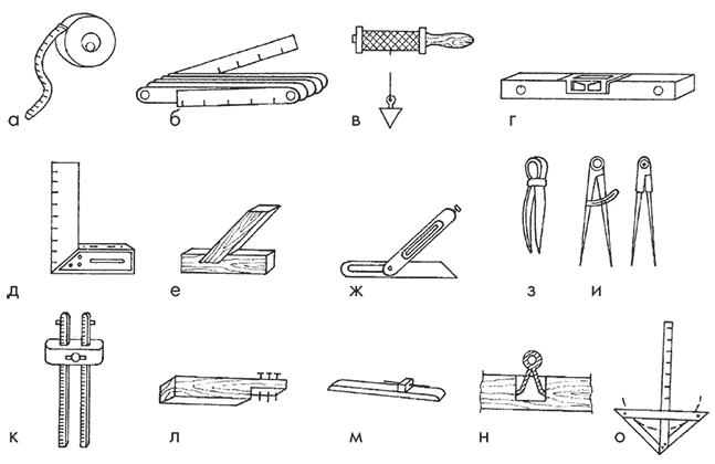 Рис. 170. Измерительные и разметочные инструменты: а – рулетка; б – складной метр; в – отвес; г – уровень; д – угольник; е – ерунок; ж – малка; з – черта; и – циркули; к – рейсмус; л – скоба; м – отволока; н – циркуль для измерения внутренних размеров; о – угольник с линейкой для определения центра окружности