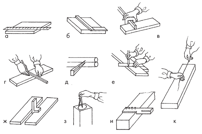 Рис. 171. Нанесение разметки с помощью: а – линейки; б – угольника; в – рейсмуса; г – малки; д – черты; е – ерунка; ж – отволоки; з – циркуля; и – скобы; к – шнура