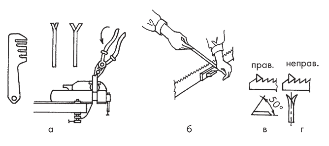Рис. 173. Подготовка пилы к работе: а – разводка зубьев; б – заточка зубьев; в – сечение зуба пилы после заточки; г – разведенные и заточенные зубья пилы