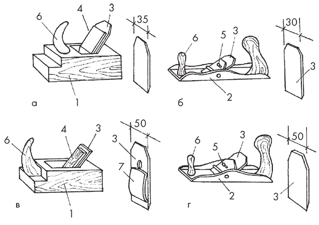 Рис. 174. Инструменты для строгания (размеры указаны в миллиметрах): а – деревянный шерхебель; б – металлический шерхебель; в – деревянный рубанок; г – металлический рубанок; 1 – деревянная колодка; 2 – металлическая колодка; 3 – стальной нож-резец; 4 – клин; 5 – винт; 6 – рожок; 7 – стружколоматель