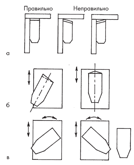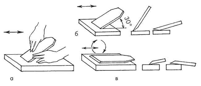 Рис. 175. Заточка ножа инструмента для строгания: а – положение ножа при заточке; б – положение фаски; в – снятие заусенца
