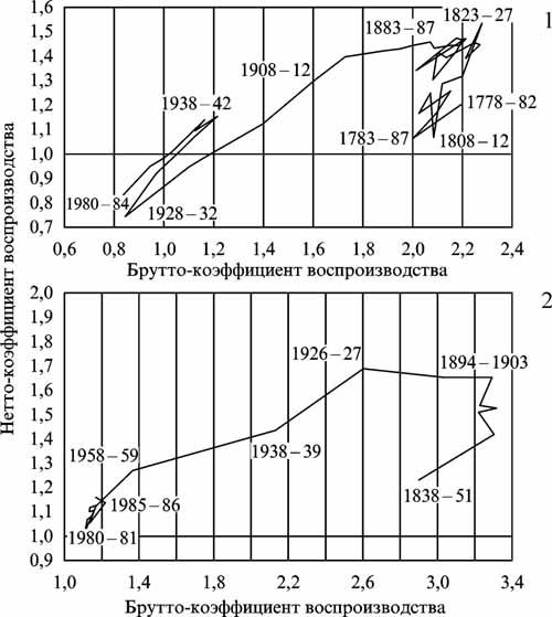 Рис. 8.1 Фазовые диаграммы для брутто– и нетто-коэффициента воспроизводства населения Швеции (1) и России (2) [61]