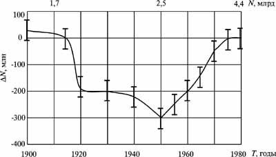Рис. 8.2 Оценка потерь населения при мировых войнах ХХ в. Интеграл с 1915 до 1975 г. составляет 11070±50 млн чел.-лет