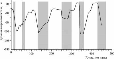 Уровень мирового океана определен на основе изотопного состава кислорода для донных осадков и коралловых рифов в Красном море. Оледенения в Плио–Плейстоцене выделены серым фоном
