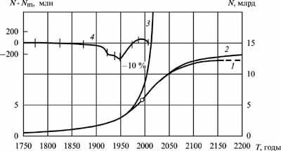 Таким образом, учитывая степень приближенности, общее согласие этих оценок на всем протяжении прошлого следует считать удовлетворительным вплоть до самого начала появления человечества и оценки времени ,T. Это тем более удивительно, что расчет подразумевает постоянство констант роста, которые определены на основании современных данных и которые тем не менее применены и к далекому прошлому, указывая на то, что модель верно схватывает основные черты роста населения мира, а значения постоянных K и за все время развития человечества существенно не менялись. В сопоставлении данных расчета и палеоантропологии следует отметить, что важны две даты – начала антропогенеза 4-5 млн лет тому назад и начала эпохи В 1,6 млн лет тому назад, которые нам известны лучше, чем оценки численности населения.