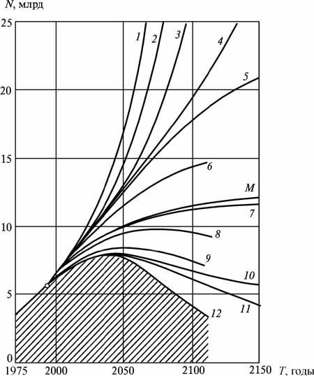 1– постоянная рождаемость, 2 – постоянная скорость роста, 3 – кризис третьего мира, 4 – высокий вариант ООН, 5 – средневысокий вариант ООН, 6 – медленный спад рождаемости, 7 – средний спад рождаемости, 8 – медленное снижение смертности, 9 – постоянная смертность, 10 – средненизкий вариант ООН, 11 – низкий вариант ООН, 12 – быстрое снижение рождаемости, M – модельный расчет, o – настоящее время. Область неизбежного роста заштрихована
