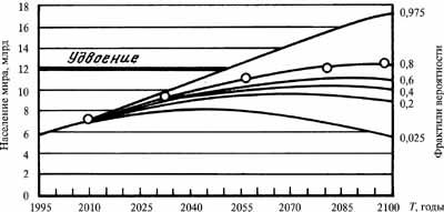 Акимов для среднего варианта и в предположении стабилизации показал, что население мира может установиться на уровне 11,6 млрд после 2100 г. [71]. Интересно последнее исследование проблемы роста населения Земли, предпринятое в IIASA. Полученные оценки приблизились к модели и практически перекрывают ее. Но, как подчеркивает Лутц, после 2030 г. эти результаты становятся все менее достоверными именно из-за неустойчивости методов, основанных на экстраполяции современных данных. В последней ревизии, предпринятой в связи со вторым изданием обзора [78], авторы обратились к вероятностному представлению данных, где все результаты образуют некоторый коридор, в котором оценивается вероятность прогноза (рис. 4.7). В этом случае данные модели лежат уже в непосредственной близости к усредненным данным последнего прогноза.