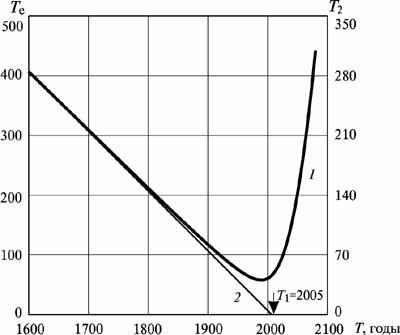 Преобразование масштаба времени есть кинематическое следствие модели, отвечающее кинетике квадратичного, гиперболического роста. В настоящее время по мере приближения к критической дате 2005 г. Te уже отступает от линейной зависимости и проходит через свое минимальное значение Te , min=60 лет, отвечающее указанному выше среднегодовому росту на 1,7% и времени удвоения T2=0,7Te=42 года. В предвидимом будущем по мере прекращения роста после T1, время изменений будет быстро расти – как квадрат удаления от критической даты. Эффективное время истории, сцепленное с ростом населения, будет растягиваться, и это определит режим развития человечества, коренным образом отличающийся от взрывного роста во всю предшествующую эпоху.