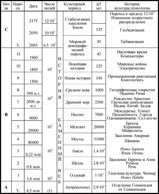 В табл. 5.2, построенной в логарифмическом масштабе, времена отсчитываются от настоящего времени – фактически уже от критической даты T1=2005 г. Таким образом хронология, приведенная в курсе археологии Фачинни [41], практически точно следует расчетной, которая уже на всем протяжении развития человечества показана в следующей табл. 5.3. Эта таблица подытоживает весь путь развития человека – от раннего антропогенеза до предвидимового будущего.