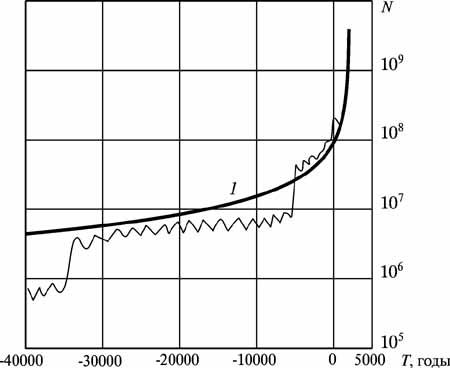 Рис. 5.2 Рост населения мира начиная от 40,000 лет тому назад: 1 – модель [59]