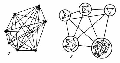 Рис. 6.1 Возникновение парных взаимодействий в системе многих частиц в неагрегированном ~N2 (1) и агрегированном состояниях ~(N/K)2 (2)
