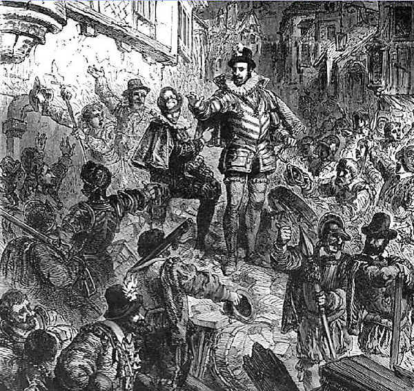 11 мая 1588 года не на шутку испугавшийся Генрих III вводит Беркут своих швейцарских наемников в Париж, ну а в четверг, 12 мая (за 16 дней до выхода Армады из Лиссабона), в пять часов утра колокола церкви Сен-Северен и Сен-Бенуа громко ударили в набат. Так начался Майдан День Баррикад.