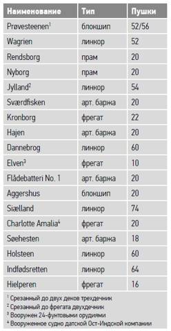 Кроме того, 12 канонерок, каждая из которых несла по две 24-фунтовые пушки и два холька с 12-фунтовками. Также датчане для обороны гавани Копенгагена располагали следующими кораблями (со снятым такелажем и укороченными для боя мачтами):